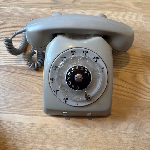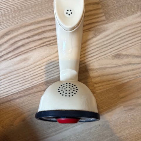 Legetøjstelefon fra begyndelsen af 70'erne. "Kroppen" er af træ. Virker endnu. Med en masse brugsspor. Trænger til at blive renset.