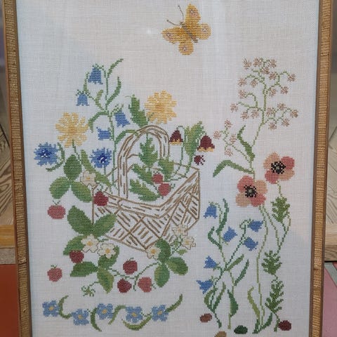 Broderi i ramme med blomstermotiv