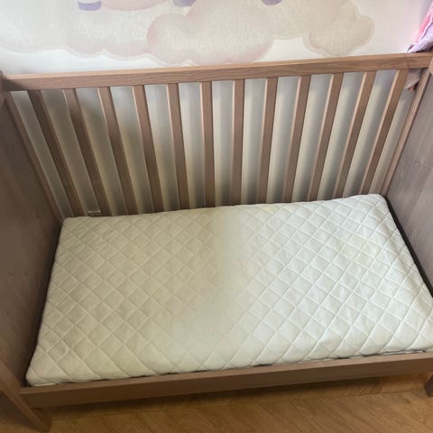 IKEA sammenklappelig tremmeseng til børn. Sengen har blåt tekstil med stjerne- og månemønster samt sider med net, der giver udsyn og ventilation. Bundpladen er i træ/finér. Konstruktionen er let og kan foldes sammen, så den fylder minimalt ved opbevaring eller transport. Velegnet som ekstra seng eller rejseseng til mindre børn.