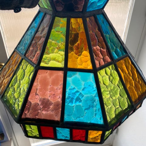 De produceres vist ikke mere men dengang de gjorde blev mosaikkerne håndstøbte i USA og sammensat til disse smukke lamper hos Nostalgia i Sverige.