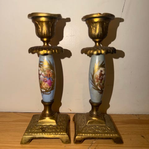 Smukt sæt med 2 stk. vintage lysestager der er lavet i en kombination af messing og porcelæn. Lysestagerne stammer fra Limoges regionen i Frankrig og er lavet i 1950'erne-1960'erne. Disse lysestager er kendt for kombinationen af små håndmalede porcelænselementer og dekorativt udformet messing. Messingen i lysestagerne er støbt med flotte mønstre, selve bunden på lysestagen er støbt i en rund blomster form med flotte detaljer hele vejen rundt. Toppen af lysestagen er støbt i form af roser. I midten af lysestagerne sidder et flot stykke rosa porcelæn med små romantiske motiver påmalet begge sider samt guld detaljer.