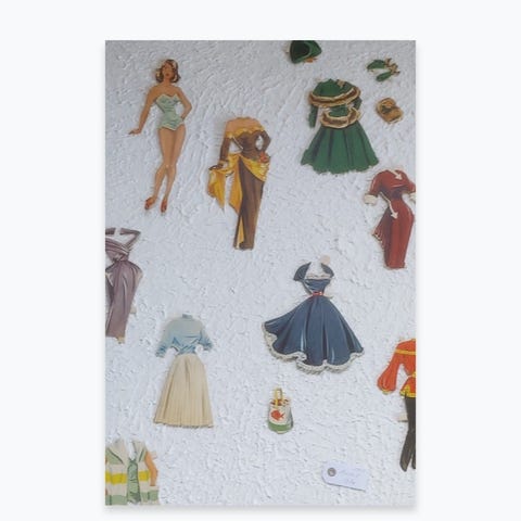 🧸 Tag et nostalgisk trip tilbage i tiden med denne originale samling påklædningsdukke med masser af tøj – klar til leg eller som retro pynt.