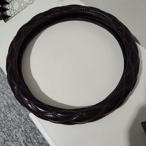 Universal ratbetræk til bil i kunstlæder i sort med røde syninger. Rundt betræk, der monteres uden på bilens rat for at give et tykkere greb og beskytte det originale rat. Velegnet til standardrat i personbiler, forudsat at dimensionerne passer til bilens ratdiameter.