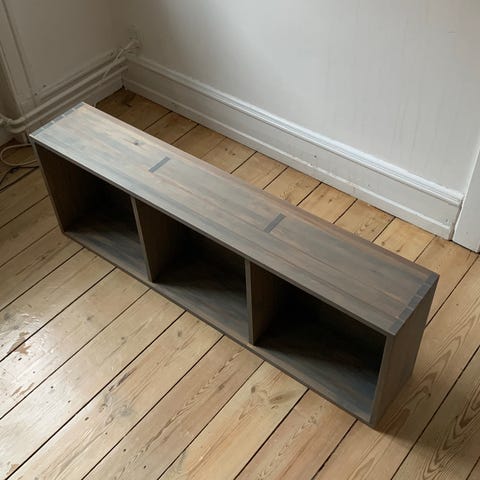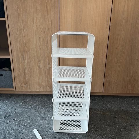 En medium skobakke passer perfekt under reolen, og på hylderne.