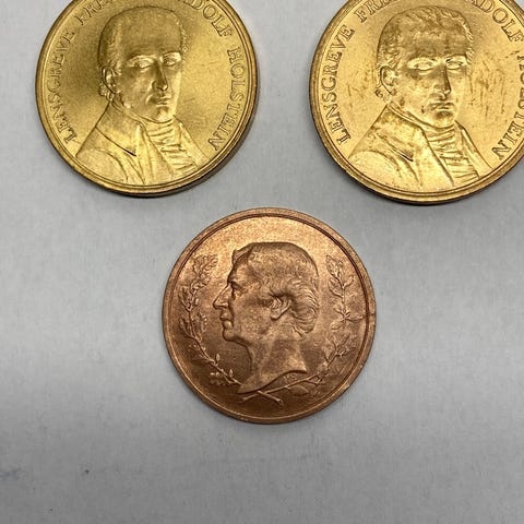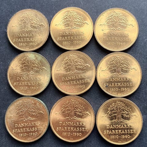 Disse medaljer er fra Danmark og er præget med teksten "DANMARKS SPAREKASSER 1810-1960". Nogle af medaljerne viser også et portræt af "LENSGREVE FREDERIK ADOLF HOLSTEIN".
