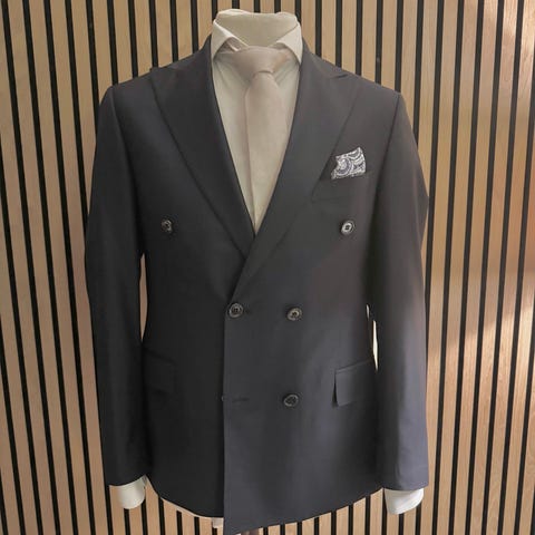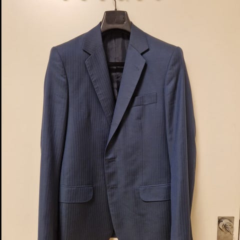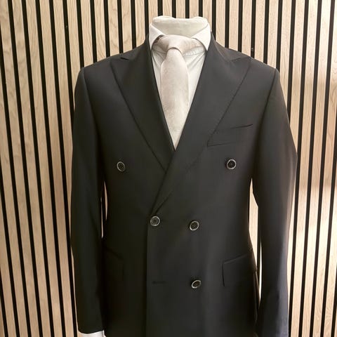 En rigtig flot dobbeltradet jakkesæt. Mørk blå farve i nålestribet. Sættet er i 95 % uld og 5 % elesthan. Brugt meget få gange. Pasformen er smal. Passer til en der er mellem 165-175 i højden. Superflot sæt som den næste ejer bliver glad for. Størrelsen er 48 men er nok bedre til en der passer størrelse 46