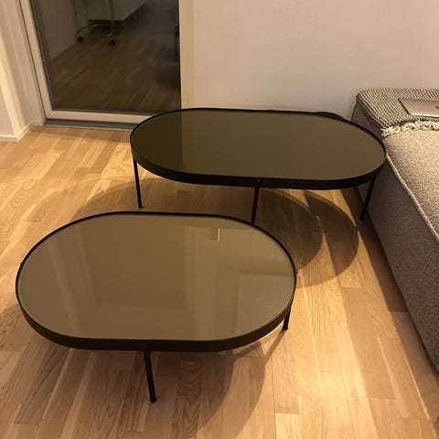 Ovale sofaborde med sort pulverlakeret stel og hærdet mat glas.