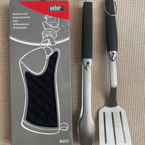 Stegespatel i metal med en sort håndtag. Den har tre lange åbninger i fladen, som gør den ideel til at vende mad under stegning. Den samlede længde er 46 cm. til grillen fra weber aldrig brugt 88