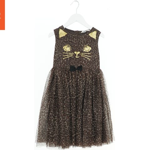 Denne kjole har en beige base med et leopardprint i sort og pink. Den har korte ærmer og elastik ved halsudskæring og talje, hvilket giver en afslappet og komfortabel pasform.