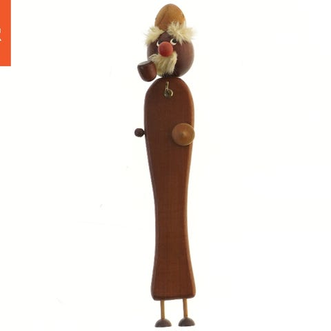 Træfigur der forestiller en mand med en pibe. Figuren er lavet i mørkt træ og har detaljer såsom en hat og en lille pibe. Den har en enkel og minimalistisk design med små fødder og arme. Figuren kan stå oprejst og har en størrelse på 42 cm. Den er ideel til dekoration og kan placeres i forskellige rum for et klassisk og kreativt udseende.