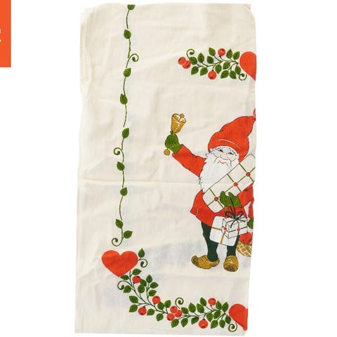 Dugen er fremstillet i stof og måler 92x82 cm. Den har et festligt julemotiv med tryk af lys, grankvister og hjerter på en orange baggrund, hvilket gør den ideel til juleborddækning.