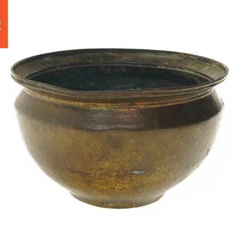 Dekorativ gammel skal, som er dekoreret med flotte mavebælter fra cigarer indvendig og messingkant øverst. Udvendig er skålen betrukket med filt/velour. Skålen er rund med en diameter på 11,5 cm.