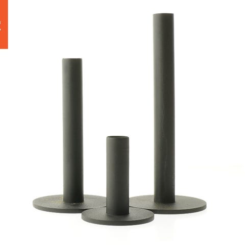 Dette er et sæt bestående af tre sorte lysestager lavet af metal. Hver lysestage har en solid rund base og en cylinderformet holder til lys. De har en minimalistisk og moderne designstil og kan bruges til at holde stearinlys i forskellige højder. Dimensionerne for lysestagerne er 23,5x18,5x9,5 cm.