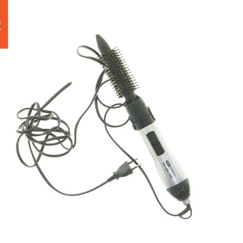 Dette er en elektrisk varmluft krøllejern, der måler 35 cm i længden. Den har en cylindrisk form med børster rundt om, og den er designet til at style og tørre håret med varm luft. Den leveres med en ledning og et EU-standard stik. Den har justerbare indstillinger for varme og hastighed. Børsten er primært sølvfarvet med sorte detaljer.