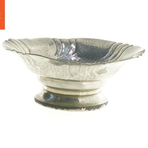 Tin fad med en bred bund og udsmykkede detaljer omkring kanten. Mærket Pewter Haugrud Norway 320. Har spor af brug og patina, som tilføjer en vintage charme.