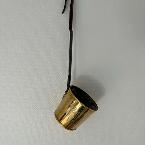 Antik ske i kobber, messing og træ (str. Ø 11 cm)