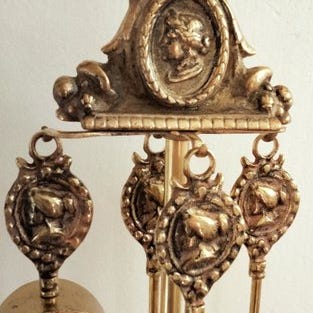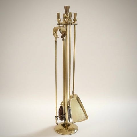 Femstykket fransk pejseservice i bronze og forgyldt bronze, Art Deco-antik stil, ca. 1950–1960, højde 70 cm, diameter 70 cm, dybde 16 cm, vægt 3,2 kg, model Clés -70 cm hauteur, i fremragende ubrugt stand. Klik på den blå "gå til varen" knap, for at købe eller byde på denne vare. Den samlede pris vil blive vist inden du afgiver dit bud.