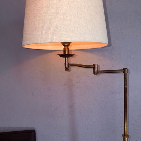 Lampen er udstyret med en stor klassisk stofskærm med en subtil struktur og en elegant kantafslutning, der spreder et varmt og stemningsfuldt lys. Designet passer smukt til interiører i Hollywood Regency, mid-century, vintage eller klassisk stil.