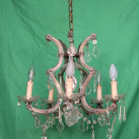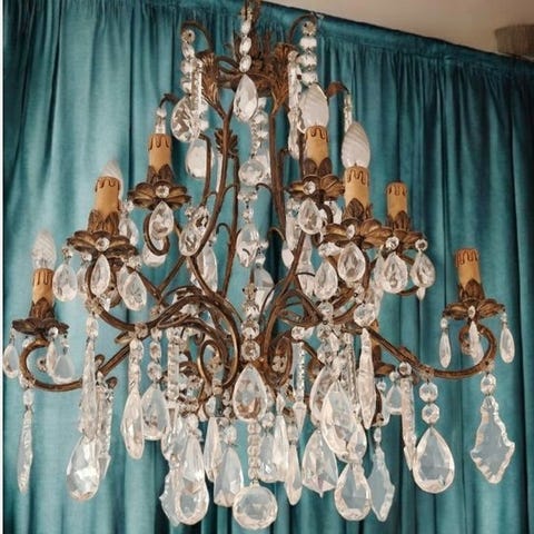 Italiensk hængelampe i messing og krystal i Louis XIvI-stil, messingramme dekoreret med krystaldråber, 90 cm høj, 42 cm i diameter, 9 fatninger, i god brugt stand med slid og alderstegn, i funktion. Klik på den blå "gå til varen" knap, for at købe eller byde på denne vare. Den samlede pris vil blive vist inden du afgiver dit bud.