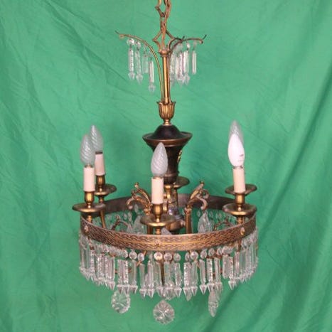 Storslået lampe i Luigi XVI-stil, med en konstruktion i messing dekoreret med krystaldråber, der sprer det scintillerende lys. I god stand med brugsspor og alderstegn, dimensioner: samlet højde 90 cm, maks. diameter 42 cm.