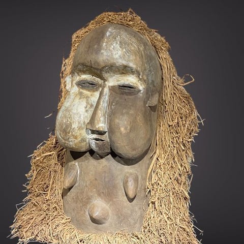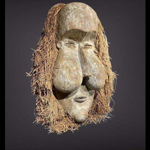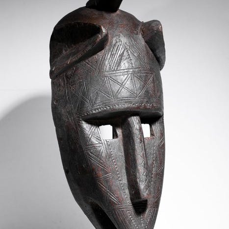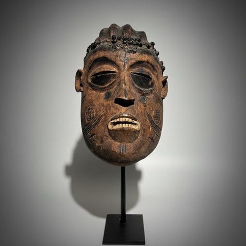 Ndaaka-maske, en trænd maskering fra ndaaka-folket i Den Demokratiske Republik Congo, fra midten af det 20. århundrede, højde 24 cm, bredde 13 cm, vægt 400 g, autentisk/original og provenance fra privat samling, leveres uden stand. Klik på den blå "gå til varen" knap, for at købe eller byde på denne vare. Den samlede pris vil blive vist inden du afgiver dit bud.