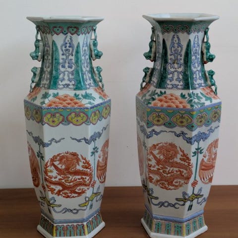 Original kinesisk porcelænsøjaloks vase fra Jingdezhen, Kangxi-perioden (ca. 1650–1700), kaldet Large Octagonal Vase, blå og hvid underglasur paneler med Borgere i Bjerglandskaber og 100 Skatte, højde 23,2 cm, i god stand med glazuresboble og en lille fyldt hak ved kanten. Klik på den blå "gå til varen" knap, for at købe eller byde på denne vare. Den samlede pris vil blive vist inden du afgiver dit bud.