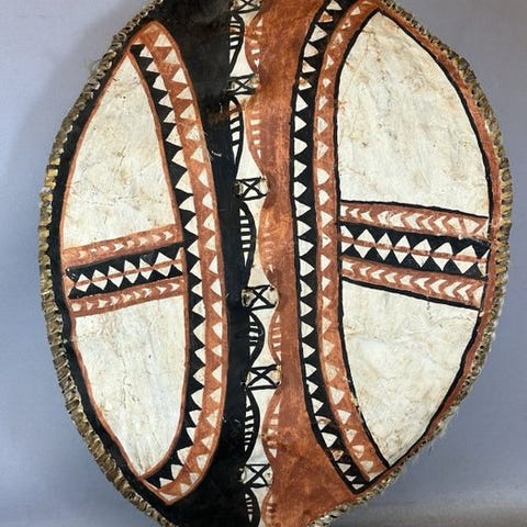 Rundt træskjold fra Madagascar i Sakalava-kulturen, dækket af zebuhud, mål: 52 cm høj, 46 cm bred, 8 cm dyb, vægt 1,8 kg, i rimelig stand. Klik på den blå "gå til varen" knap, for at købe eller byde på denne vare. Den samlede pris vil blive vist inden du afgiver dit bud.