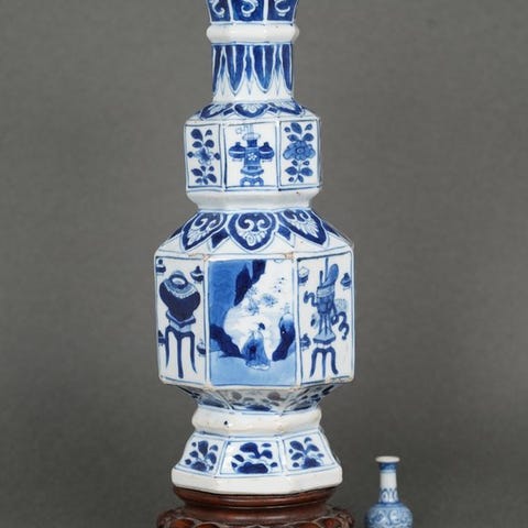 Et par sekskantede porcelænsvaser fra midten af det 20. århundrede fra Kina, måler 60 x 22 x 22 cm, i god brugt stand med mindre tegn på alder og pletter. Klik på den blå "gå til varen" knap, for at købe eller byde på denne vare. Den samlede pris vil blive vist inden du afgiver dit bud.