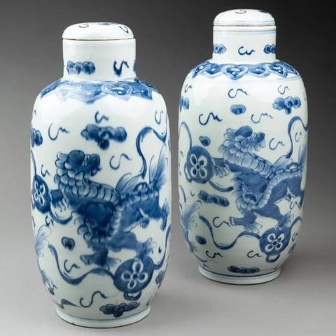 Elegant par sekskantede porcelænsvaser af kinesisk oprindelse fra midten af det 20. århundrede. Dekoreret med raffinerede drager i ferrugendrød og fenikser i polykrom farver, har de karakteristiske reliefhåndtag, der forestiller Vagtløverne (Fo-hunde) i smaragdgrøn. Et par med stor dekorativ virkning.