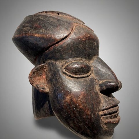 Original Bwami-maske fra Lega-kulturen i Den Demokratiske Republikken Congo fra en privat samling. Klik på den blå "gå til varen" knap, for at købe eller byde på denne vare. Den samlede pris vil blive vist inden du afgiver dit bud.