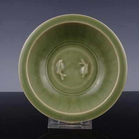 Kinesisk porcelænslejeskål i celadon/Ge-type fra Qing-dynastiet (1644-1911), dateret ca. 1750–1800, leveres med træfod, målene 16 cm bred, 6 cm høj og 16 cm dyb, i god stand med små tegn på alder og pletter. Klik på den blå "gå til varen" knap, for at købe eller byde på denne vare. Den samlede pris vil blive vist inden du afgiver dit bud.