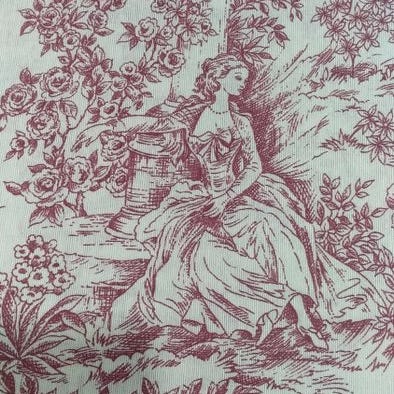 Bomuldstof, helt ny TOILE DE JOUY i en ensfarvet bordeauxnuance med creme baggrund, med dimensionerne cirka 280 cm i bredden og 600 cm i længden.