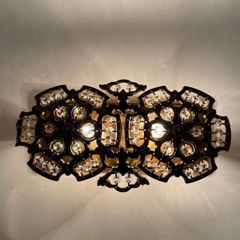 Stor, tung struktur i messing-bronze, toppet med et væld af perler af ægte bohemiske krystaller, der glitrer.