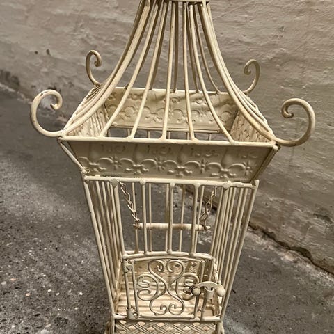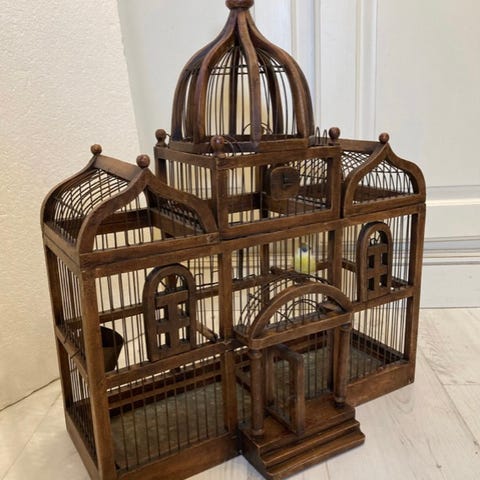 Fuglebur - Træ, Metal - Decorativ trompe l'oeil fuglebur med et billede af en...