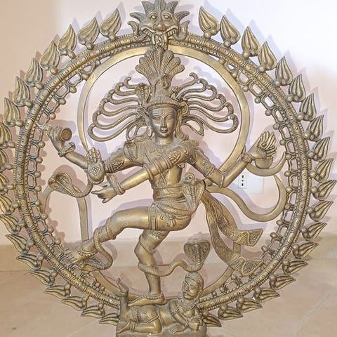 Shiva er vist i sin kosmiske dans (Ananda Tandava), et ben løftet og det andet knuser dæmonen Apasmara, personificeringen af uvidenhed og spirituel glemsomhed. Denne bevægelse udtrykker