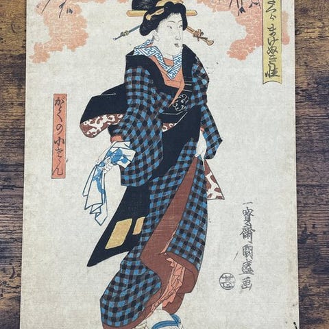 Utagawa Yoshifuji (1828–1887), elev, afholder af Kuniyoshi, viser et trepanelers originalt træsnit-triptyk på Morbærpapir med titel Klik på den blå "gå til varen" knap, for at købe eller byde på denne vare. Den samlede pris vil blive vist inden du afgiver dit bud.