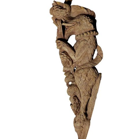 Originalt tempelornament fra Ubud/Bali, Indonesien, i teaktræ med drage-motiv, mål 57 × 25 × 8 cm, vægt 4710 g, oprindelse Indonesien, provenance Galleria/antikvariat, Sene 1800-tals, i fremragende stand, leveres med stand. Klik på den blå "gå til varen" knap, for at købe eller byde på denne vare. Den samlede pris vil blive vist inden du afgiver dit bud.