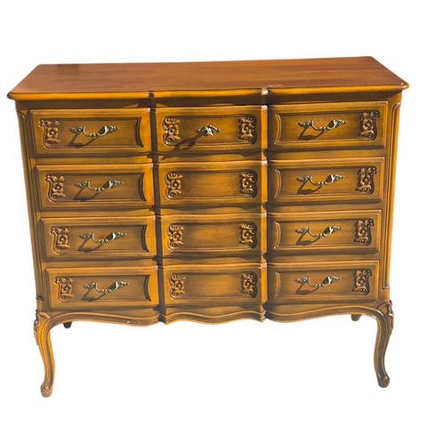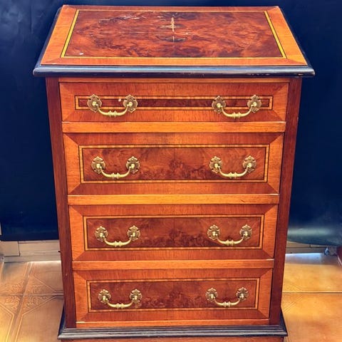Elegant kommode med syv skuffer i træ, fint indlagt og med bronzefittings. Generelt i god stand med tegn på tidens gang; billederne er en del af beskrivelsen.