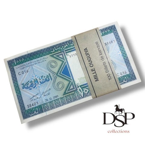 Originalt sæt af 100 sedler til 1000 Ouguiya, Mauretania, dateret 28.11.1981, Pick 3d, ikke gradueret. Klik på den blå "gå til varen" knap, for at købe eller byde på denne vare. Den samlede pris vil blive vist inden du afgiver dit bud.