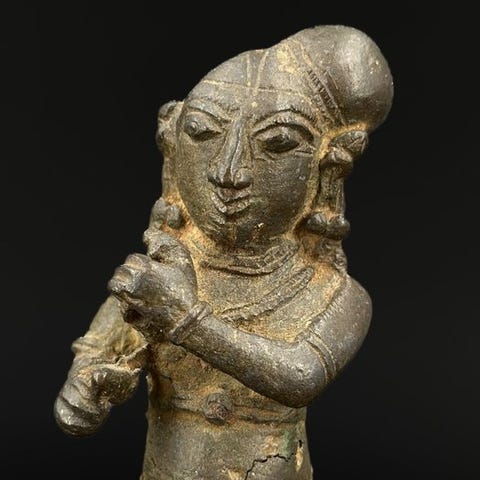Indien, 19. århundredes sydindiske bronzekunst Balakrishna danser i post-Nayak-dynasti-stil, 12,2 cm høj, 4,9 cm bred, 4,3 cm dyb, vægt 418 g, delvis sølvindlæg i anklerne og rektangulær sokkel, i fremragende stand. Klik på den blå "gå til varen" knap, for at købe eller byde på denne vare. Den samlede pris vil blive vist inden du afgiver dit bud.