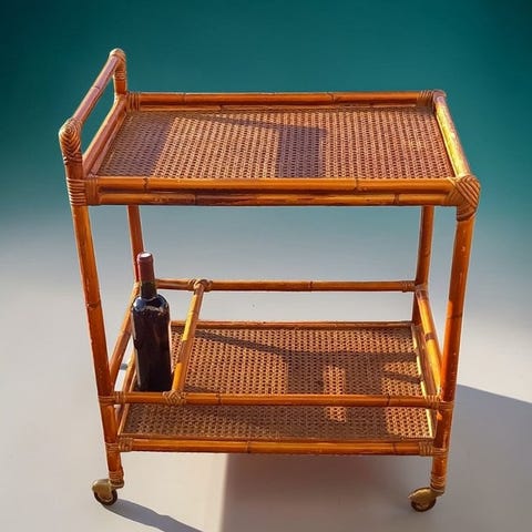 Afgiv dit bud på en italiensk serveringsvogn i en smuk originalstand. Fremstillet af Messing med flotte håndtag og prægede kanter. Et ægte højdepunkt for kræsne. Billederne taler for sig selv; de udgør også en del af beskrivelsen og viser den originale tilstand af stykket. Vognen demonteres ved forsendelsen af sikkerhedshensyn, men kan nemt sættes sammen igen.