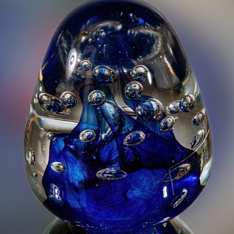Sjælden og spektakulær glas-papirstøtter ‘Rose Petal’ designet af Peter Holmes til Selkirk Glass (1998) i Skotland; håndlavet glas med blå bund, stor hvid- og rosa magnolia-blomst og fire grønne blade, Ø 8,3 cm, højde 7,5 cm, underskrevet på bunden 'Selkirk Glass Scotland 1998'; i meget god stand med minimale brugsspor. Klik på den blå "gå til varen" knap, for at købe eller byde på denne vare. Den samlede pris vil blive vist inden du afgiver dit bud.