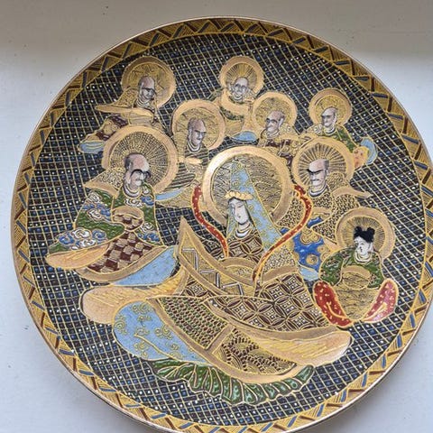 Et Taishō-periode (ca. 1912–1926) Eitokusai Hina-dolls-møbel sæt i sort lak med guldkakiæ, bestående af en dekorativ hylde og tre dokumentkasser på en rød base, med originalæske, hyldens dimensioner ca. 14 × 16 × 6,5 cm. Klik på den blå "gå til varen" knap, for at købe eller byde på denne vare. Den samlede pris vil blive vist inden du afgiver dit bud.