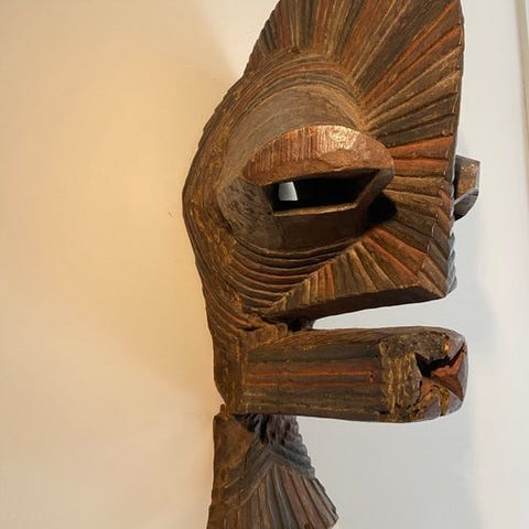 Maske Songye Kwifebe fra Den demokratiske republikken Congo, provenance Privat samling, udskåret træ med naturlige pigmenter, mål 51 × 23 × 25 cm, vægt 1200 g, i god stand. Klik på den blå "gå til varen" knap, for at købe eller byde på denne vare. Den samlede pris vil blive vist inden du afgiver dit bud.