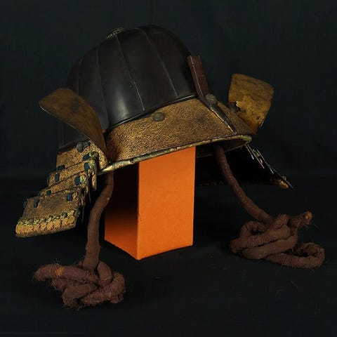 En lakkeret og rustjern-sujibachi kabuto 筋鉢兜 (hjelm med forhøjede ribber) udstyret med en ‘Daikoku’s rat’ maedate (decorativ frontkvist).