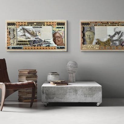 “Centrale Bank Guinee 100 Frs” er et i hårdttræ udskåret og malet oversized banknot af Thomas Tchopzan (1960-2024) i stort format (helt 115 cm bred). Værket er håndsigneret, dateret og udstyret med en håndskrevet titel. Som et ekstra får køberen også selve banknoten, som det er modelleret efter.