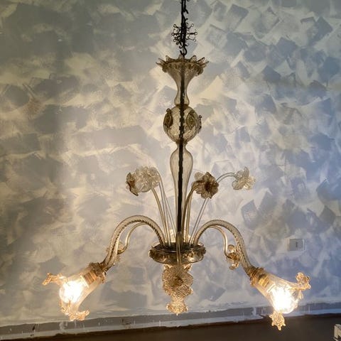 Pragtfulde lysekroner. Hele af gennemsigtigt mundblæst glas i en jernramme. Kunstnerisk genstand af høj kvalitet, italiensk kunst i glas. Lampen er en jernramme mundblæst. I en unik form. Med masser af patina på jernet. Ledning og fatning E27 testet. Alt fungerer optimalt. Klar til ophængning. Brug varmt lys for et forbløffende resultat.