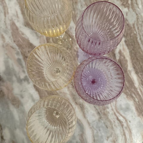 5 smukt formede glas med matteret/sandblæst ydre. Købt fra og bemalede af Anne Just. Der er resterende blomstermotiver i varierende grad, da de har været for meget i opvaskemaskinen.