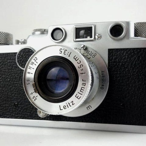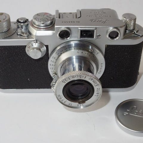 Leica III (Model F) sort målesøgerkamera (1933) Serienr.: 118603, med to objektiver og blitz. Kameraet er smukt kosmetisk og god teknisk stand. Funktionstætig, med film blev testet. Leitz Elmar 1:3,5 f=50 (1933 nickel) Nr:185329 objektiv. Linsen er ren, uden ridser eller svampe. Leitz Hektor 1:4,5 f=13,5 Nr:539874 (1939).