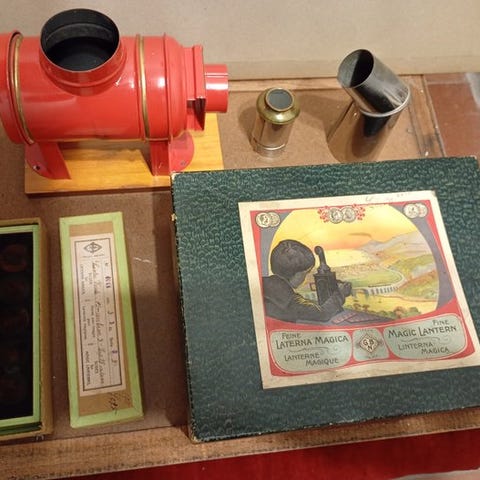 Ernst Plank – E.P. – BiNG ? – 1880–1900 Laterna Magica med håndmalet glasbilledskive (10 × 18 cm), titulert Muis verdwijnt in mond slapende man, i ny stand, med ét hovedapparat. Klik på den blå "gå til varen" knap, for at købe eller byde på denne vare. Den samlede pris vil blive vist inden du afgiver dit bud.